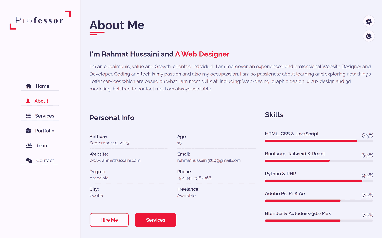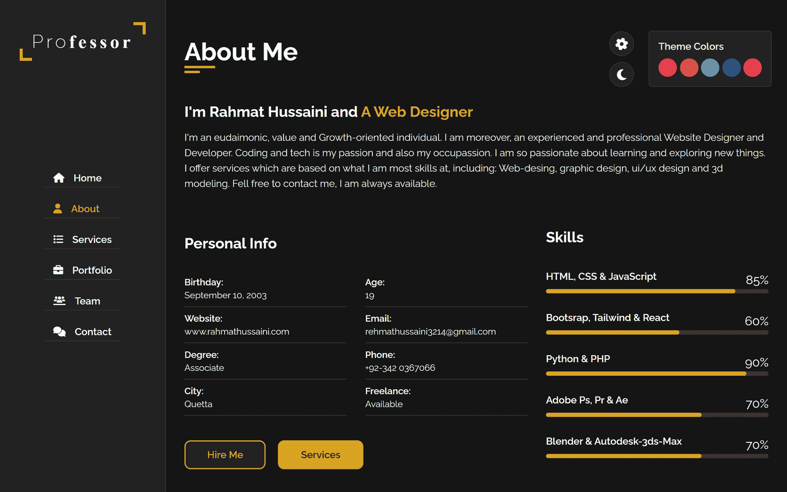 I'm an eudaimonic, value and Growth-oriented individual. I am moreover, an experienced and professional Website Designer and Developer. Coding and tech is my passion and also my occupassion. I am so passionate about learning and exploring new things. I offer services which are based on what I am most skilled at, including: Web-designing, graphic designing, ui/ux design and 3d modeling. Fell free to contact me, I am always available.